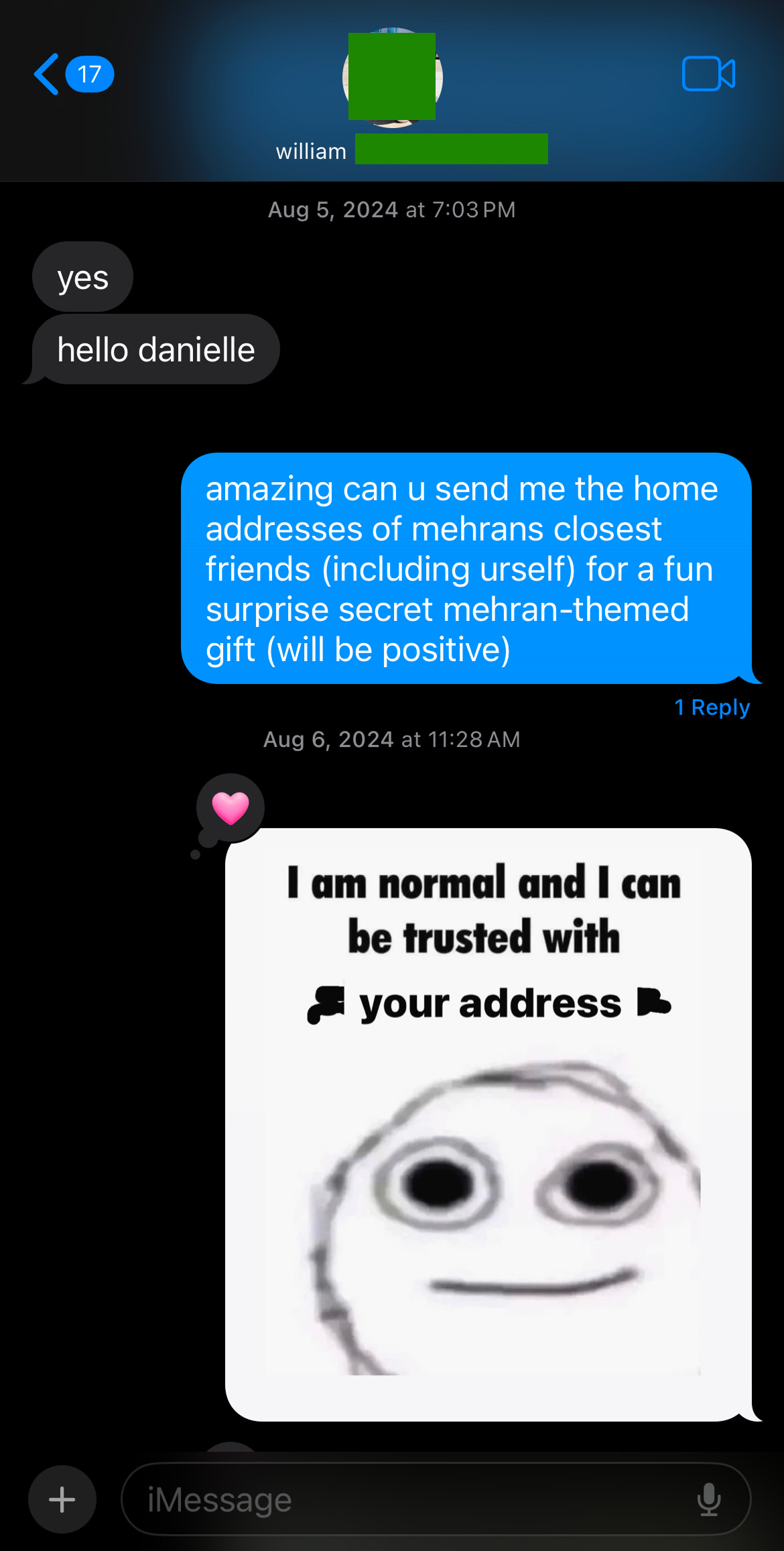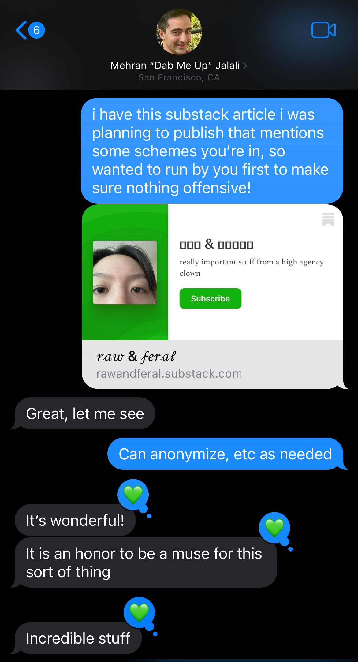 Also, you may be wondering - why are so many of your schemes targeted towards Mehran? Well, Mehran is a great target/muse because he has outsized reactions and loves attention. I also have quite a bit of positive karma with featuring Mehran, considering the first time I did so I made him an international superstar.