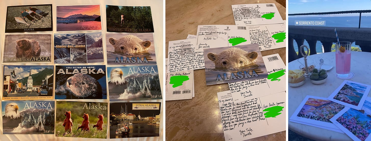 Physical mail is really an under-utilized medium these days. I got really into mailing my friends postcards when I was traveling to exotic locations like Capri, the Amalfi Coast, and Alaska. I would roleplay as a wealthy, capricious older woman and pen elaborate messages.