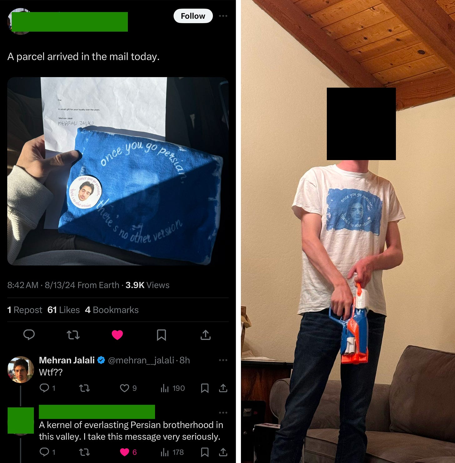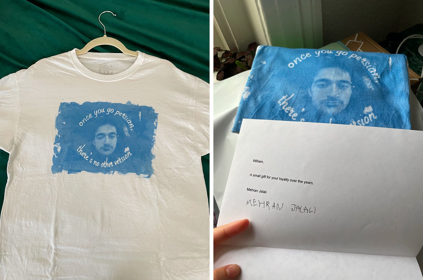 I shipped them to his friends’ homes and hoped they would just wear the shirts to hang out with Mehran without asking questions. And that is exactly what they did.