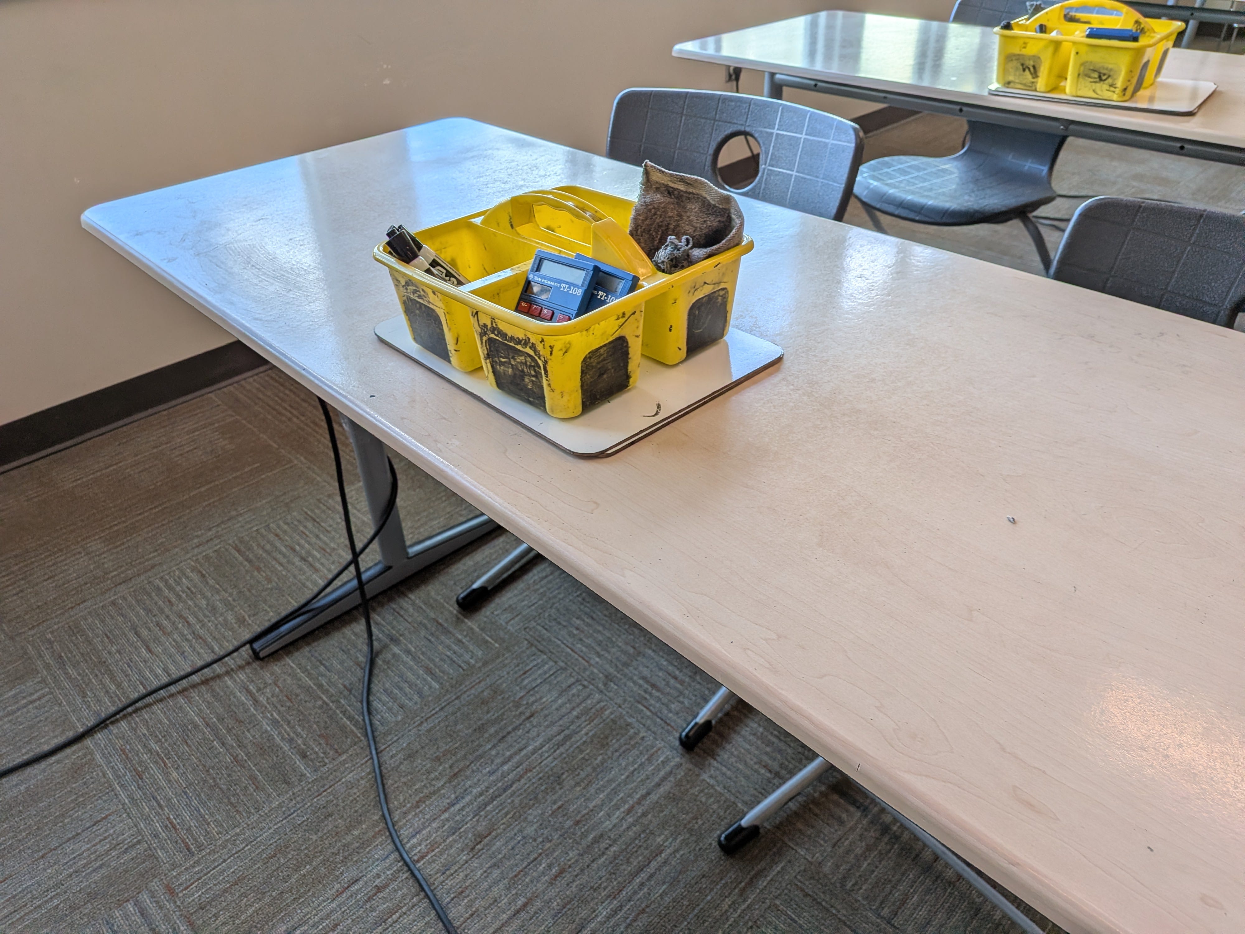 A: I found the whiteboards in my room when I started at this school. Any whiteboards will do, though I will say a regular piece of paper size works well, they don’t need to be much bigger than that. Two-sided whiteboards are nice because it’s very tempting to graffiti the back. We don’t do much graphing in 7th grade but if you teach older students there are two-sided mini whiteboards with a coordinate plane on one side. Erasers are just pieces of cut-up towel. Initially my school provided plenty of markers. The budget is a bit tighter now, and when they stopped providing markers I made a bit of a fuss. I said that science teachers get lab supplies, English teachers get books, and so on, and for me, the essential tool in my math class is mini whiteboard supplies. My principal agreed to spare a bit of money. I buy markers in bulk. I get by on <$100 of markers a year, and I bet you could get a set of whiteboards for your classroom for <$100. Your mileage will vary but I think that’s a perfectly reasonable ask for a typical school and you can often find some random underused department budget line to put it on. I recommend Expo for markers, the nice brand-name markers just last way longer than the cheap ones. I am also diligent about making the most of the markers I have. If a student says a marker is dead, I don’t just throw it out. I toss them in a pile on the windowsill. Sometimes it’s dead because a student didn’t put the cap on all the way, and giving it a rest with a cap on can bring it back to life. If the tip gets pushed in, I have a pair of needle-nose pliers to pull it back out.
