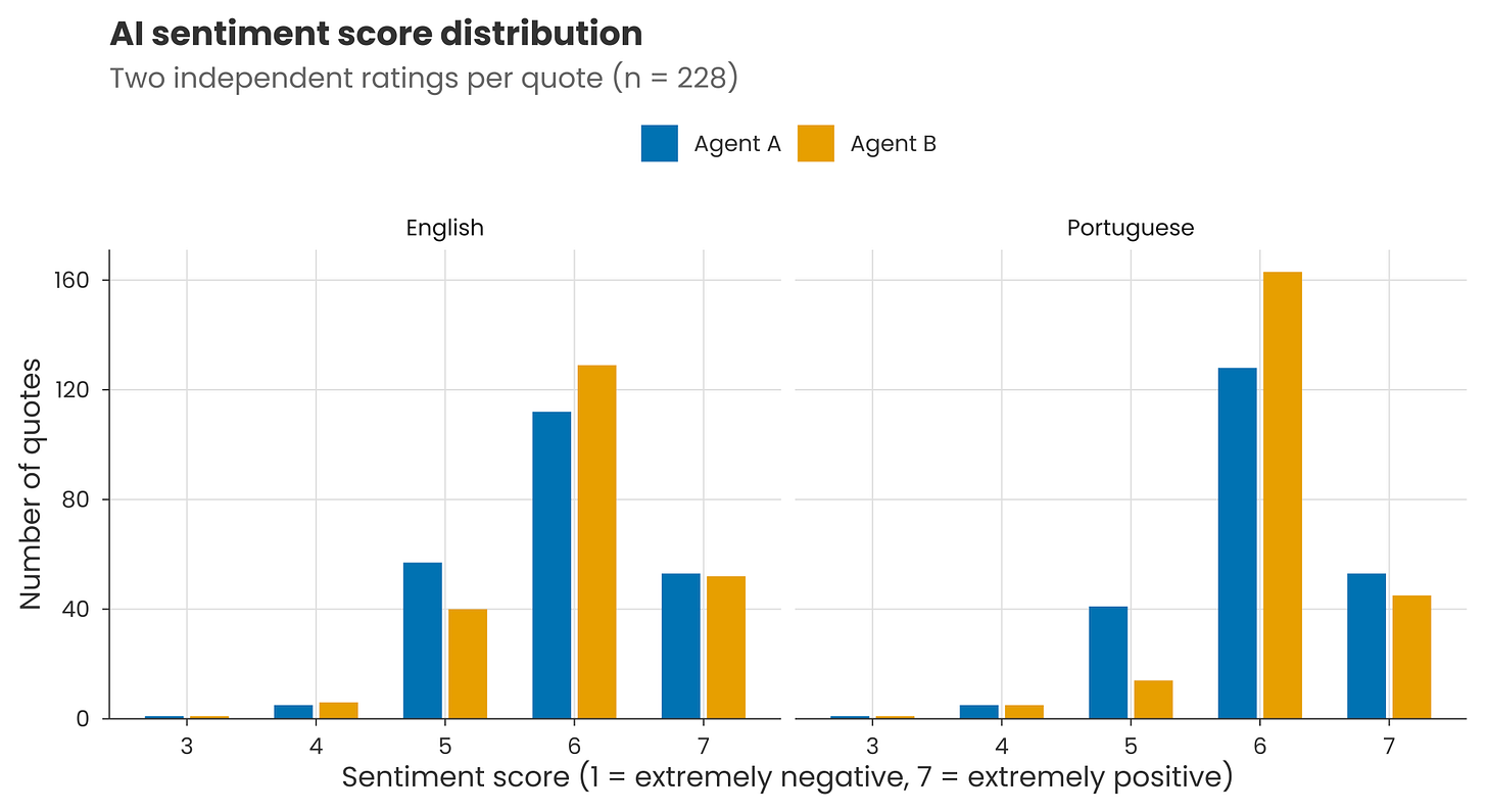 Translation uncertainty: LLMs can judge different languages in different ways. For example, when I translated those couple of hundred quotes into Portuguese and re-ran the classification prompt, the scores were more tightly centred around the mean. And re-running produced lower agreement than before, with a ~70% match for individual scores.