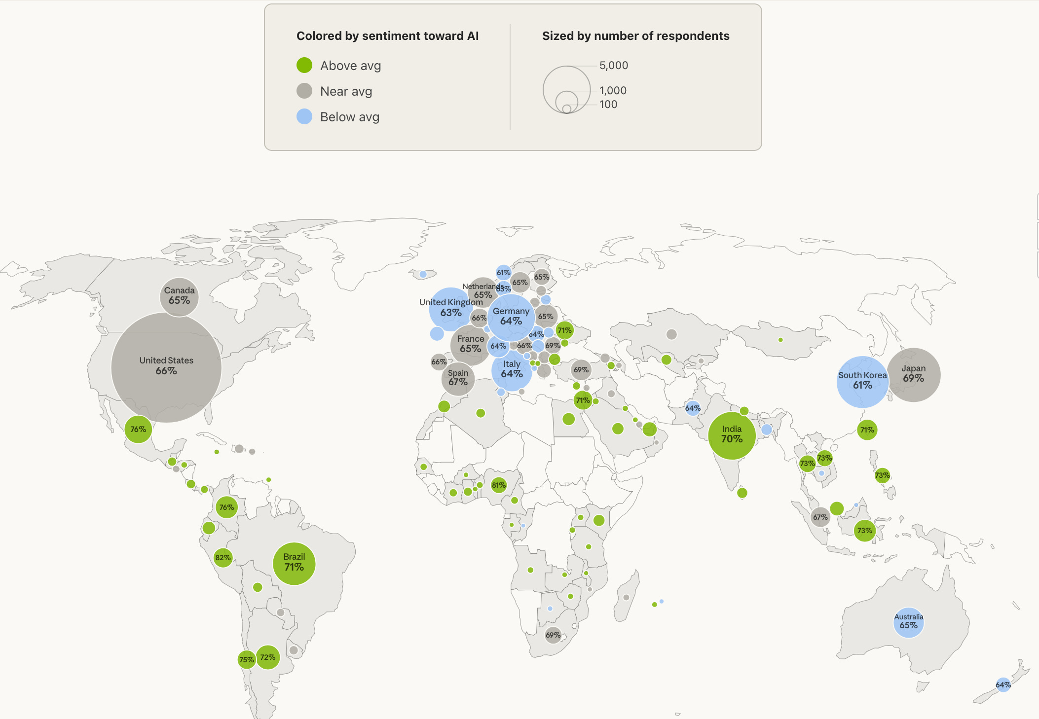 Take a recent report from Anthropic, which surveyed 81,000 Claude users about AI perceptions. It’s been getting a lot of attention, and it does include some nicely visualised interactive comparisons, such as this one looking at sentiment across different regions: