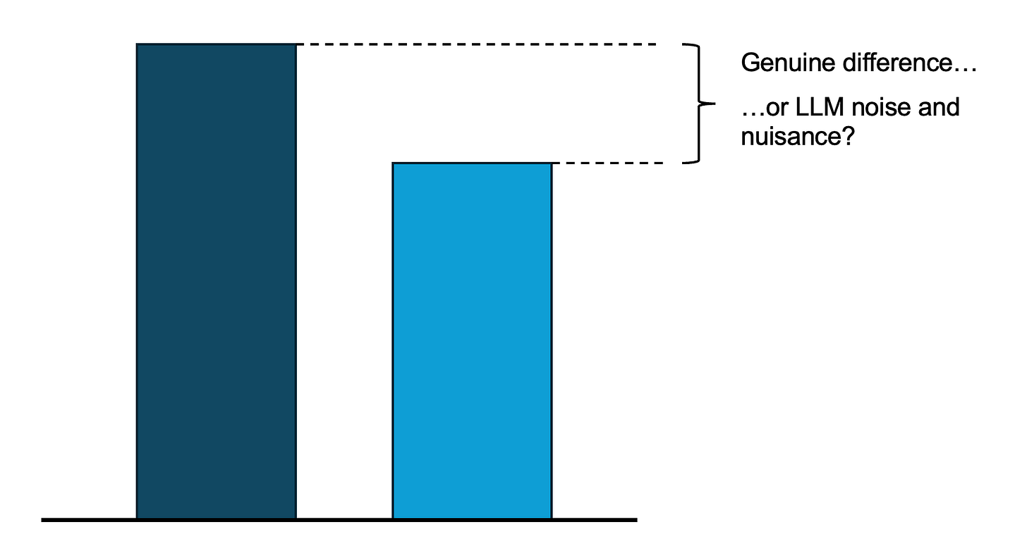 That might seem like a meaningful difference, but how confident would you be of getting the same numbers if the LLM was run again with some tweaks to the inputs? How much of that 10% difference is genuine - and how much is down to the quirks of a particular LLM run?