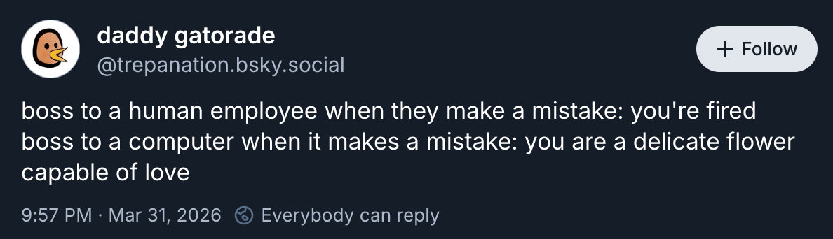 And I think that tells you almost everything you need to know about where we are. And where we are is a place where “at least the fake fuckery was produced by a biological organism” counts as a premium feature. The pitch for selling manufactured authenticity at scale is that at leas the people in the factory are still real people. That’s the floor. That’s what passes for premium. We are drowning in content that is functionally the same as so many designer handbags stitched up alongside so many dupes.